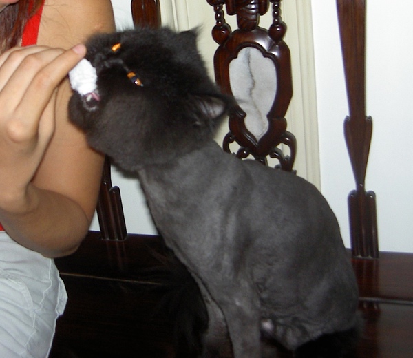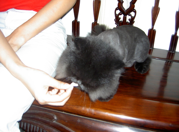 不知道有沒有貓愛吃棉花糖的,我家的其他貓聞了聞,不是奇怪的看著我,就是掉頭就走,但是黑麻麻超愛那種長長澎澎的現做棉花糖,每次買來吃都要堤防黑麻麻的搶食(小流氓就是小流氓),他自己可以吃掉1/3支。只可惜,後來有人說公貓不可以吃甜的免得會結石,從此與最愛的棉花糖絕緣了~~